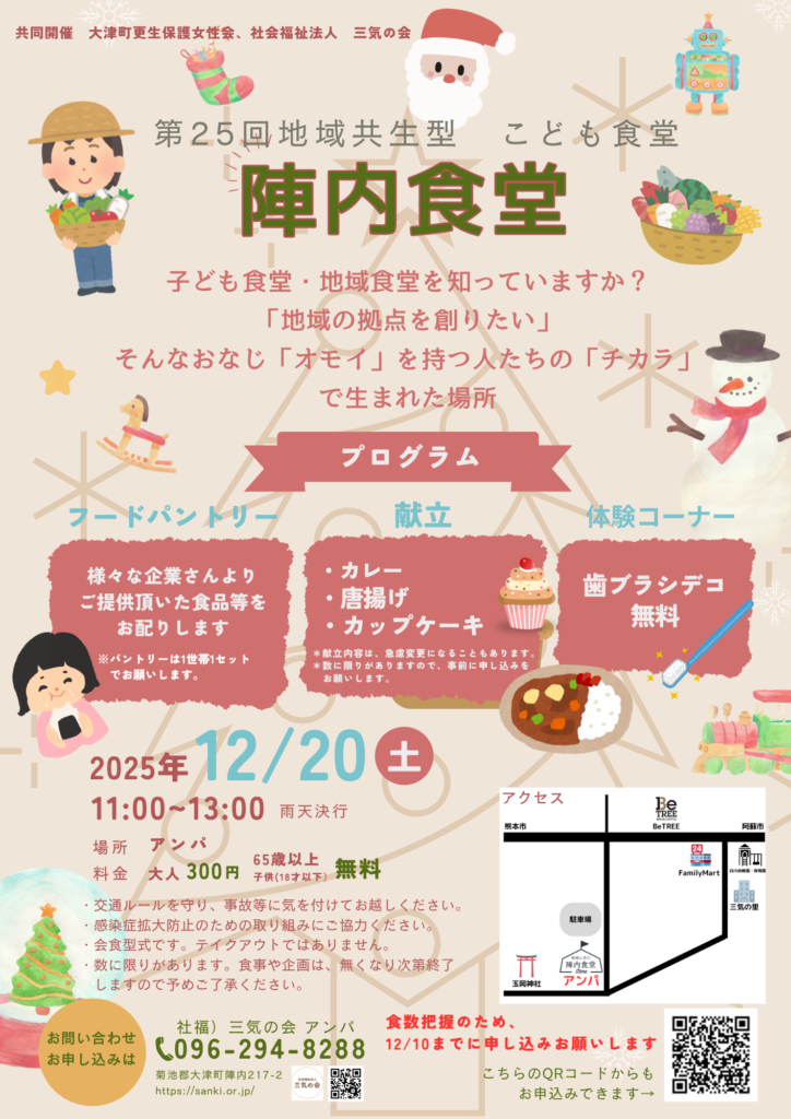 2025.11.19 イベント情報 第25回陣内食堂 きたる12月20日土曜日に、第25回陣内食堂を開催します 今回のメニューは「カレー、から揚げ、カップケーキ」 お誘いあわせの上ふるってご参加ください フードロス軽減へのご協力に感謝いたします 食数把握のため、事前のお申込みをお願い致します